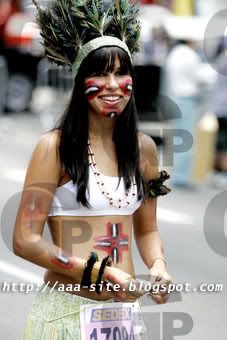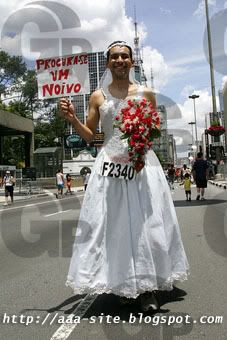 Alheio a situações estressantes envolvendo tarados e fumaça, temos diversas válvulas de escape e tentativas bem-humoradas na maratona. Provavelmente impelidos pela transmissão televisionada da competição, alguns inscritos transvestem-se de Super Homens, Mulheres-Maravilha, Super Mouse, Capitão Caverna, dentre outras bizarrices. Vale tudo neste grande vestibular por 15 minutos de fama. Até se vestir de noiva como este feio zé roela logo abaixo em vosso ecrã. Se olharem atentamente, "Procuro um Noivo" é o que diz a sua plaquinha, provavelmente pintada à tinta guache algumas horas antes da corrida. O que mais assusta é que talvez ele encontre. Ou, pelo menos, algum escocês insano numa fúria cega para bulinar algum competidor, como foi o caso de um brasileiro de cujo nome me foge à lembrança no momento. Ah, os escoceses. Seus "kilts" (a saia) tem aquele padrão tipo cobra coral para que realmente se saiba que é preciso manter distância deles. Mas nem todos os ROBERTS são perdições. Durante o meu levantamento de material para este especial do Triple-A, deparei-me com algumas felicidades.